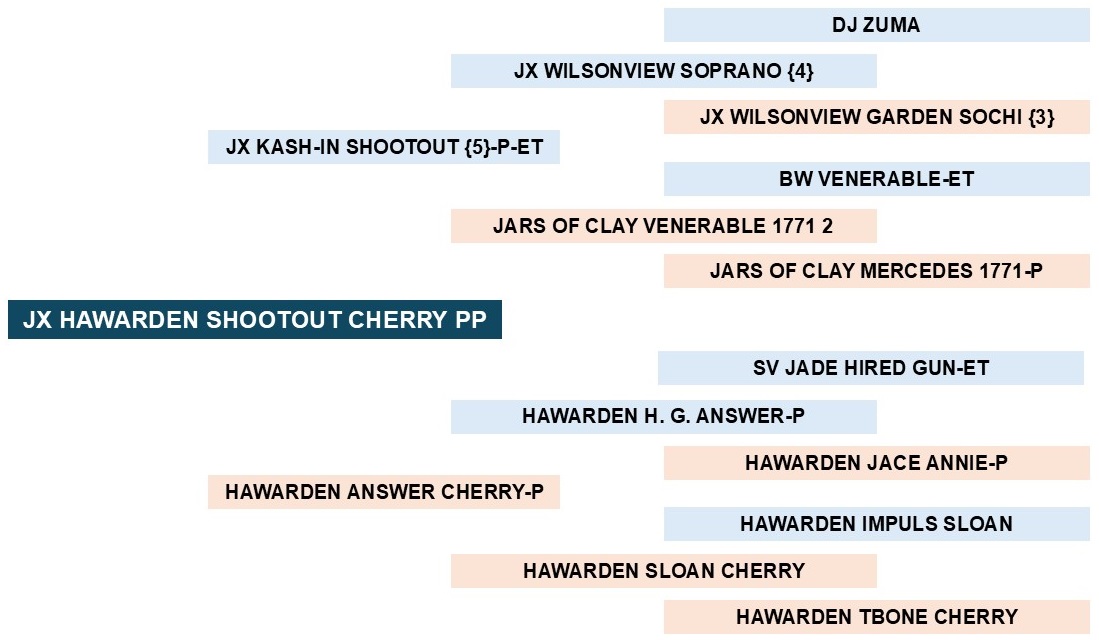 Filha de JX KASH-IN SHOOTOUT {5}-P-ET (pedigree abaixo), ela carrega três gerações de animais calssificados EX-90% ou mais, além de vacas com produções que ultrapassam as 20.000 libras de leite (lactações acima de 9 mil kg em 305 dias), expressando todo potencial de uma genética sólida e comprovada.