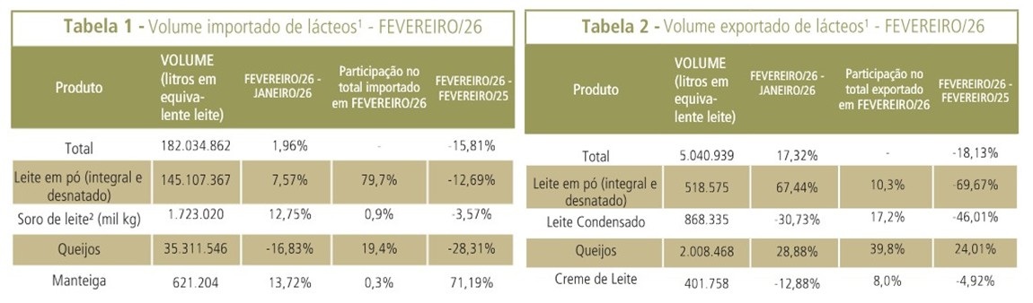 O leite condensado e os queijos foram os lácteos com maior participação nos embarques brasileiros em fevereiro, representando 17,2% e 39,8% do total, nesta ordem. As vendas de leite condensado diminuíram 30,73% em relação a janeiro, somando 868,36 mil litros EqL. Os envios de queijos, por outro lado, aumentaram 28,88%, para 2,01 milhões de litros EqL.