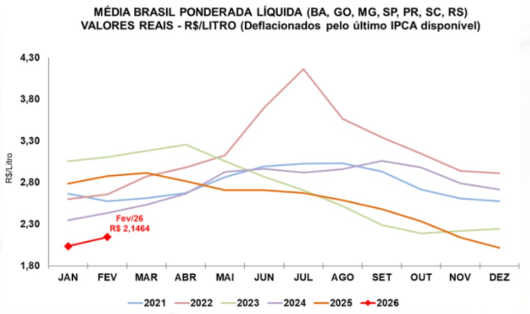 Gráfico 1. Série de preços médios recebidos pelo produtor (líquido), em valores reais (deflacionados pelo IPCA de fevereiro/2026)