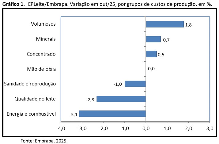 Em sentido contrário, três grupos apresentaram deflação no mês. A redução de preços da energia elétrica e da gasolina fizeram com que o grupo “Energia e combustível” apresentasse variação de -3,1%. “Qualidade do leite” e “Sanidade e reprodução” também registraram retrações de -2,3% e -1,0, respectivamente. Os dados constam do Gráfico 1.