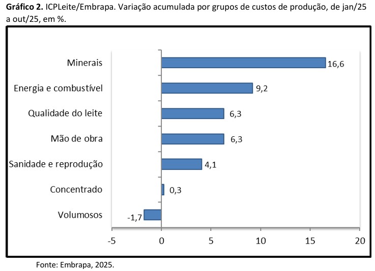 No acumulado entre janeiro e outubro deste ano, a inflação de custos atingiu 2,6%, com destaque para a elevação em “Minerais” (16,6%), “Energia e combustível” (9,2%), “Qualidade do leite” (6,3%), mesmo percentual de aumento para o acumulado no grupo “Mão de obra”. O grupo “Sanidade e reprodução”, com elevação de custos de 4,1%, também cresceu acima da média do ICPLeite. Já “Concentrado”, com discreta variação positiva de 0,3%, e “Volumosos”, com variação negativa de -1,7%, ajudaram a conter a alta acumulada no ano. Os dados constam do Gráfico 2.