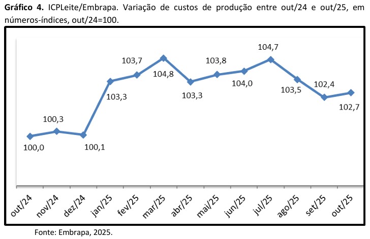 Entre outubro de 2024 e outubro de 2025, o ICPLeite/Embrapa mostrou crescimento de custos a partir de janeiro até julho, quando a tendência se inverteu, contribuindo para o resultado de 2,7% na inflação anualizada, menor que a inflação oficial brasileira, de 4,7%. O gráfico 4 mostra a trajetória do custo de produção de leite no período.