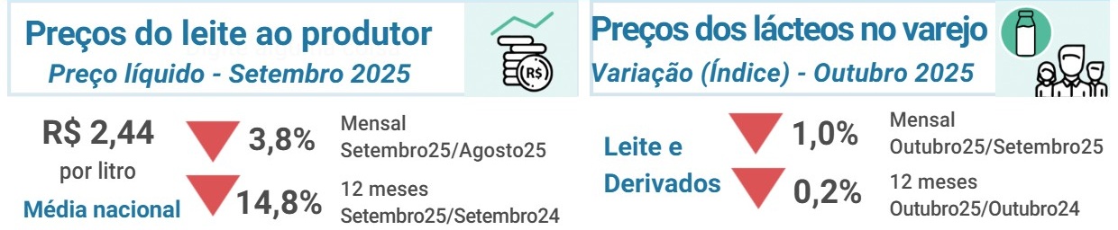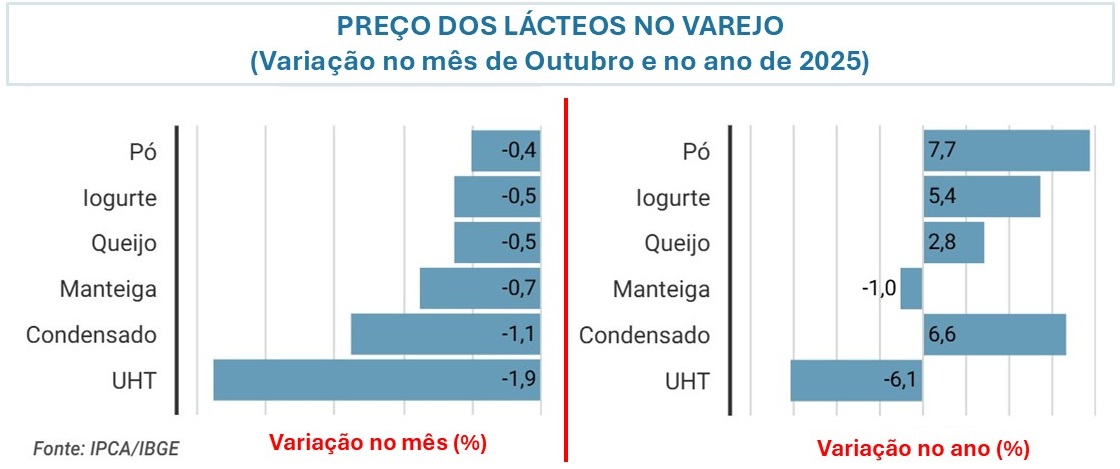 No varejo, o preço médio mensal da cesta de lácteos caiu 1,0% em outubro de 2025, e no acumulado de 12 meses, 0,2%, abaixo da inflação de 4,7% no período medida pelo IPCA. O leite em pó registrou a menor queda mensal, 0,4% e o Iogurte 0,5%. O leite UHT registrou a maior queda 1,9% seguido do leite condensado 1,1%.