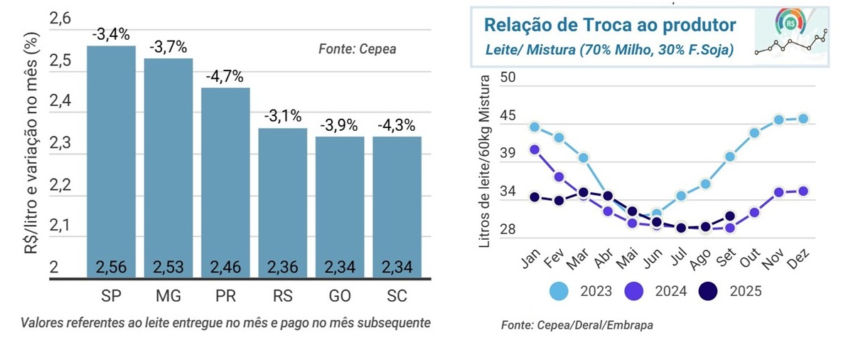 A relação de troca leite/mistura piorou em setembro de 2025 frente ao mês anterior e ao mesmo período de 2024, sendo necessários 31,1 litros de leite para aquisição de 60 kg de mistura.