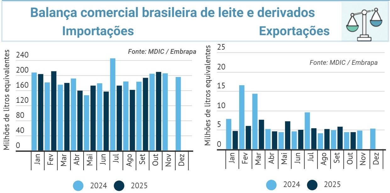 As importações brasileiras de leite e derivados totalizaram 208 milhões de litros equivalentes em outubro de 2025, com aumento de 8,2% no mês e de 2,3% nos últimos 12 meses. O leite em pó foi o principal produto importado.