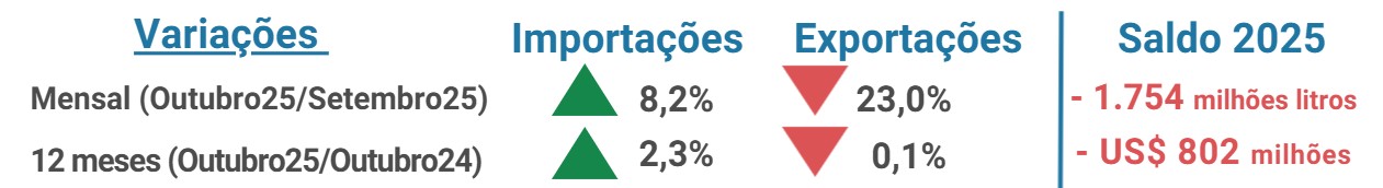 As exportações caíram 23,0% em outubro de 2025 frente ao mês anterior, totalizando 4,4 milhões de litros equivalentes, e apresentaram queda de 0,1% em relação a outubro de 2024.