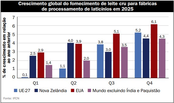 Em 2025, a produção global de leite superou as expectativas, com a produção (excluindo Índia e Paquistão) projetada para crescer 4,3%, em relação a novembro do ano anterior, e o crescimento acumulado previsto para atingir 2,7%, bem acima da média de cinco anos, o qual foi de 1,3%. Esse aumento foi impulsionado por condições climáticas favoráveis, margens agrícolas sólidas e fatores sazonais, particularmente nos Estados Unidos, América Latina, Nova Zelândia e União Europeia (UE). As informações da Rede Internacional de Comparação de Fazendas (IFCN) ajudam agricultores, processadores e partes interessadas do setor a navegar por essas tendências dinâmicas e tomar decisões informadas em um mercado leiteiro global cada vez mais complexo.