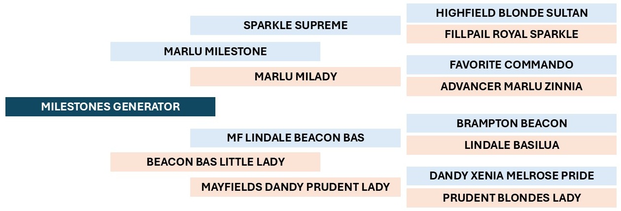 Dois anos mais tarde (1965), um filho da vaca BEACON BAS LITTLE LADY (neta de BLONDES LADY), gerado por MARLU MILESTONE, chegou a Cedarcrest com um pouco mais de 1 ano de idade. Seu nome: MILESTONES GENERATOR (pedigree abaixo). Ele foi comprado pelos Rankins da Mayfield Farms e advinha de um cruzamento cuidadosamente planejado, em um programa de melhoramento que priorizava a consistência familiar dos animais.