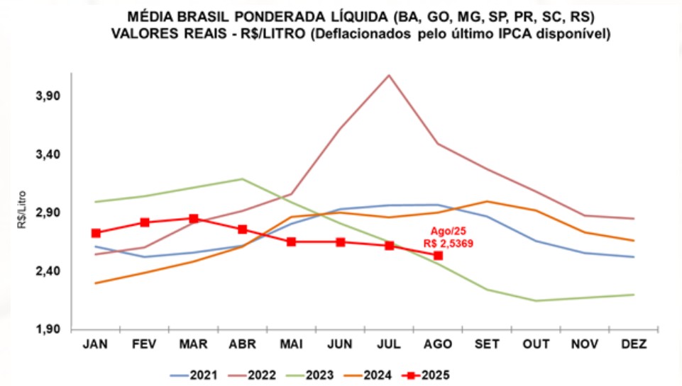 Gráfico 1. Série de preços médios recebidos pelo produtor (líquido), em valores reais (deflacionados pelo IPCA de agosto/2025)