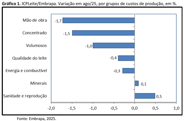 A queda registrada em agosto foi resultado de variações negativas na maior parte dos grupos que compõem o índice. A maior redução ocorreu em “Mão de obra” (-1,7%), seguida por “Concentrado” (-1,5%) e “Volumosos” (-1,0%), que juntos respondem por mais de 80% do peso total do índice, explicando a deflação no mês. Com recuos mais moderados, apareceram “Qualidade do leite” (-0,4%) e “Energia e combustível” (-0,3%), reforçando o movimento de alívio nos custos. Por outro lado, dois grupos apresentaram crescimento: “Minerais” (+0,1%), de forma quase estável, e “Sanidade e reprodução” (+0,5%), este último com a maior alta do mês. Os dados constam do Gráfico 1.