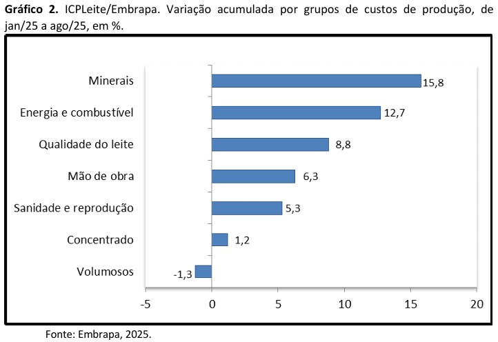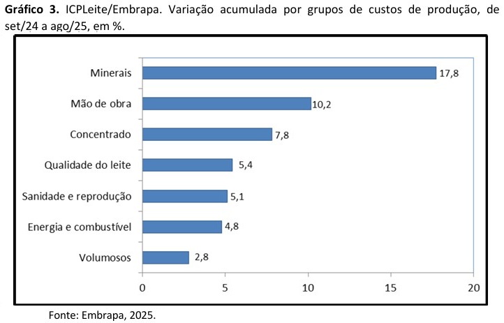 No acumulado entre janeiro e agosto de 2025, a inflação de custos atingiu 3,4%, com destaque para a elevação em “Minerais” (+15,8%), “Energia e combustível” (+12,7%) e “Qualidade do leite” (+ 8,8%). Também “Mão de obra” (+6,3%) e “Sanidade e reprodução” (+5,3%) cresceram acima da média do ICPLeite. Já “Concentrado” (+1,2%) e “Volumosos” (-1,3%) ajudaram a conter a alta acumulada no ano. Os dados constam do Gráfico 2.