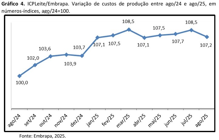 Após crescimento em julho, o ICPLeite/Embrapa registrou queda no custo de produção em agosto. A inflação de custos foi de -1,2%, acumulando 3,4% no ano e 7,2% nos últimos 12 meses. Apesar da redução no mês, o índice segue em patamar elevado, sobretudo quando observados os períodos acumulados.