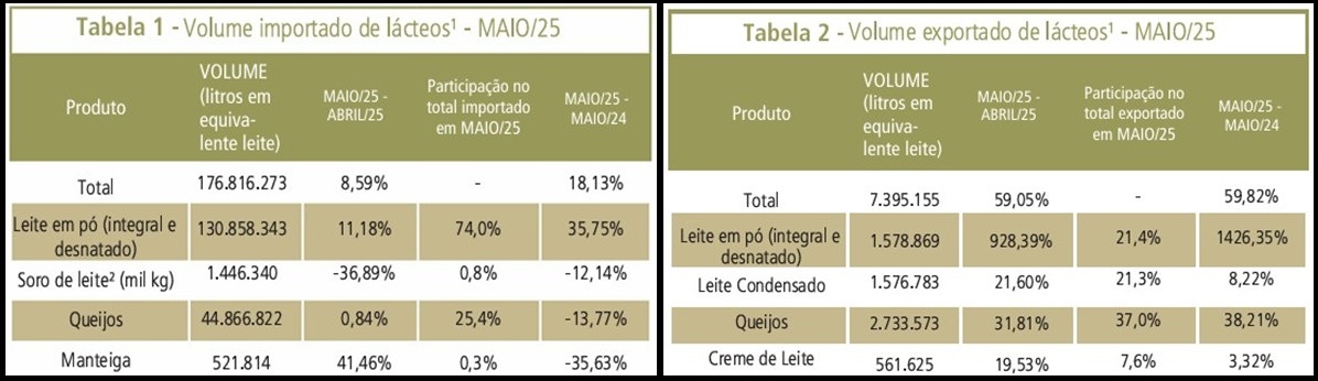As exportações brasileiras de lácteos avançaram, em maio, expressivos 59,05% em relação ao mês anterior e 59,82% sobre igual período de 2024. As importações também cresceram, 8,59% no comparativo mensal e 18,13% no anual. Com isso, o déficit da balança comercial (em volume) se elevou em 7,1% de abril para maio, chegando a 169,4 milhões de litros em equivalente leite, o que representa saldo negativo de US$ 75,7 milhões.