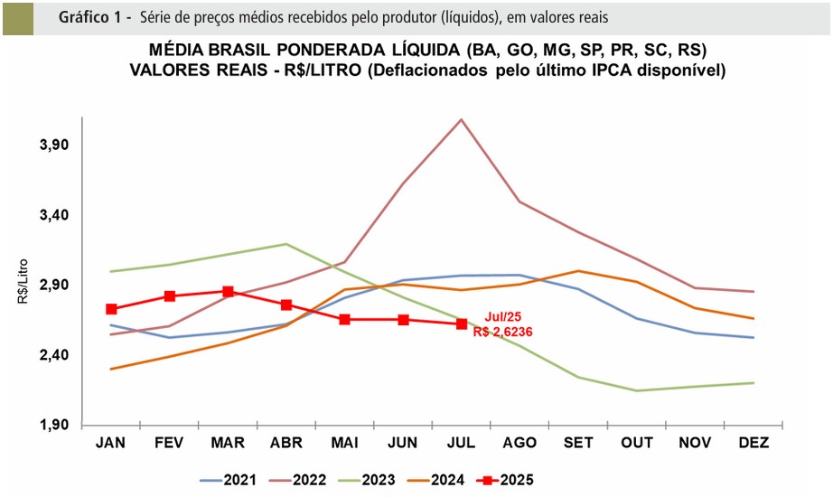 Segundo o CEPEA (Centro de Estudos Avançados em Economia Aplicada), o preço do leite captado em julho fechou a R$ 2,6236/litro na “Média Brasil”, com quedas de 1,16% frente a junho/25 e de 8,42% em relação a julho/24, em termos reais (deflacionamento pelo IPCA de julho). A desvalorização no campo ocorre em função do aumento da produção e da dificuldade da demanda em absorver a oferta.