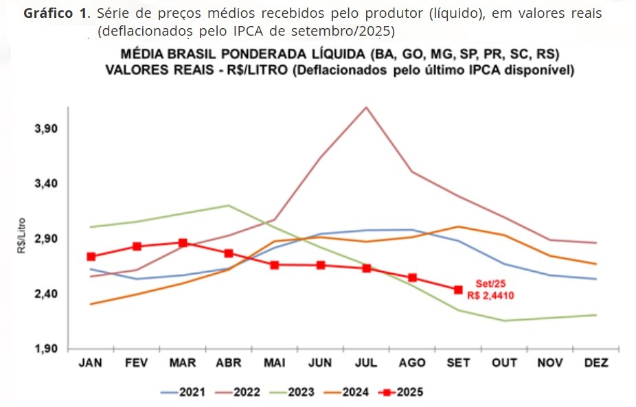 Segundo o CEPEA (Centro de Estudos Avançados em Economia Aplicada), em setembro, o preço do leite cru recuou 4,2% frente à agosto, fazendo com que a “Média Brasil” chegasse a R$ 2,4410/litro. Isto representa uma queda real de 19% em relação a setembro/24 (deflacionamento pelo IPCA de setembro/25). Trata-se da sexta baixa consecutiva nas cotações no campo e o setor projeta que esse movimento de desvalorização se persista até o final do ano, tendo em vista que o mercado doméstico está bastante abastecido.