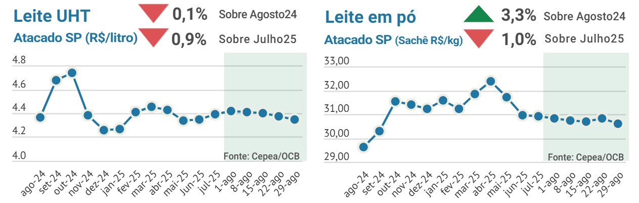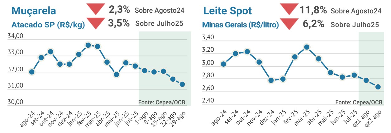 Os preços dos principais derivados lácteos mantiveram viés baixista. O queijo muçarela registrou queda mais acentuada, devido ao aumento da oferta e maior pressão de vendas. O mercado de leite UHT também apresentou um movimento de ligeira desaceleração nos preços. O leite em pó seguiu o mesmo caminho e sofrendo a concorrência das importações. No leite Spot, as cotações arrefeceram ao longo das últimas quinzenas, com maior volume de leite sendo ofertado e menor interesse dos compradores. Estoques com ligeiro aumento, forte competição entre laticínios e os varejistas buscando recuperação de margens tem mantido o mercado de lácteos mais baixista.