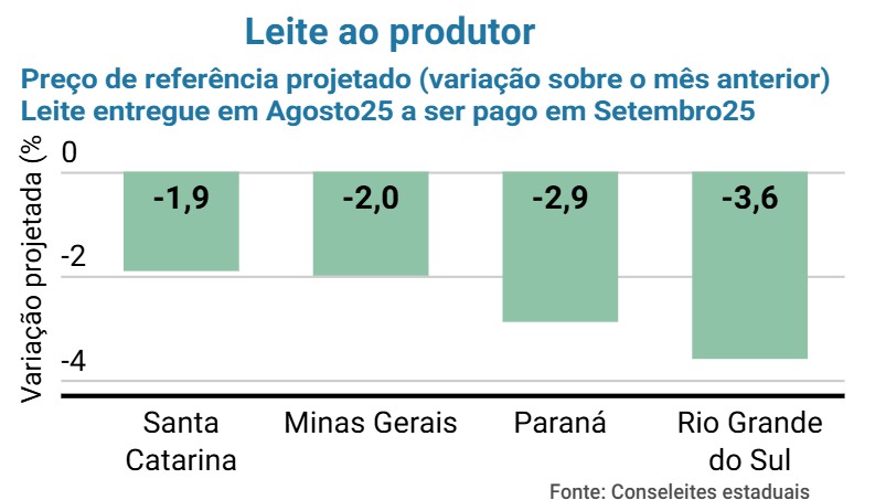As sinalizações dos CONSELEITEs para o pagamento do leite entregue em agosto apontaram queda nas projeções em todos os estados acompanhados. Paraná e Rio Grande do Sul registraram reduções mais acentuadas, enquanto Santa Catarina e Minas Gerais apresentaram recuos moderados. Mas o movimento geral foi de baixa, em linha com os preços no mercado atacadista de derivados.