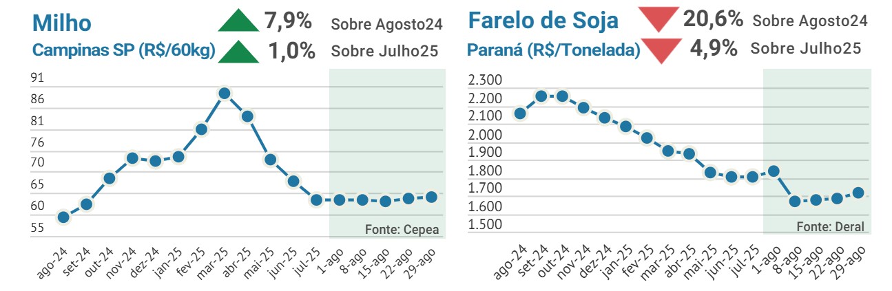 Os preços no mercado de milho ficaram relativamente estáveis no último mês, com a colheita da safrinha na fase final, mas com uma ótima produção. No mercado de soja, as cotações do farelo voltaram a recuar, com dois fatores desfavoráveis às exportações brasileiras: 1) expectativas de avanço no acordo entre Estados Unidos e China; 2) valorização do real frente ao dólar. No mercado pecuário, o boi gordo registrou pequeno aumento nos preços e puxou as cotações do bezerro, em um cenário de escalas curtas de abate e oferta mais ajustada de animais terminados, que se concentra em confinamentos neste período de estiagem. O câmbio oscilou com viés de apreciação e o Focus manteve a sinalização de crescimento do PIB em torno de 2,2% para 2025.