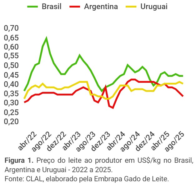 Outro fato importante é a acentuada redução do preço ao produtor na Argentina – que iniciou o ano em patamares próximos ao Brasil e Uruguai (US$ 0,42 por litro em média) – e atualmente está em US$ 0,36, contra US$0,43 no Uruguai e US$0,47 no Brasil (Figura 1).