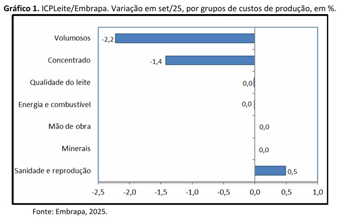 Segundo a Embrapa, pelo segundo mês seguido, produzir leite no Brasil ficou mais barato. Em setembro, o ICPLeite/Embrapa, registrou queda de 1,1%. O trimestre de julho a setembro fechou com redução no custo de produção de 1,5%. Todavia, no acumulado dos nove meses do ano, a inflação de custos foi de 2,3%. Em doze meses, a inflação acumulou 4,0%.