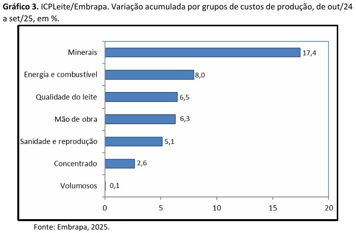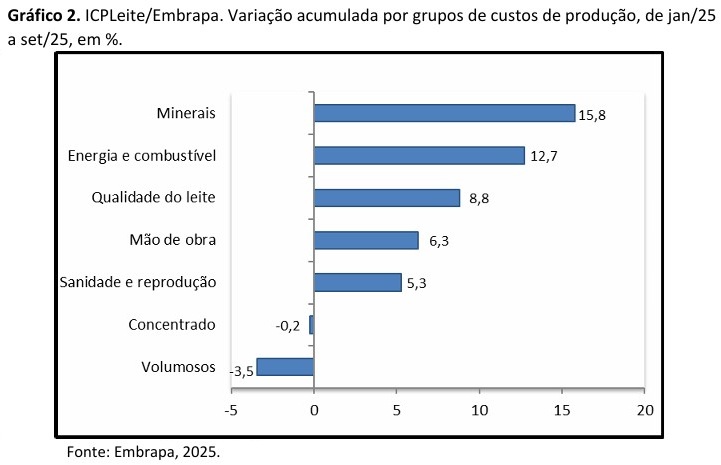 No acumulado entre janeiro e setembro de 2025, os custos de produção cresceram 2,3%, com destaque para a elevação em “Minerais” (15,8%), “Energia e combustível” (12,7%) e “Qualidade do leite” (8,8%). “Mão de obra”(6,3%) e “Sanidade e reprodução” (5,3%) também cresceram acima da média do ICPLeite. Já “Concentrado” (-0,2%) e “Volumosos” (-1,3%) ajudaram a conter a alta acumulada no ano, ao registrarem variação negativa. Os dados constam do Gráfico 2.