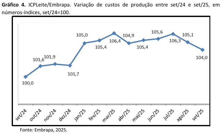 Entre setembro de 2024 e agosto de 2025, o ICPLeite/Embrapa mostrou forte aceleração de custos ao longo de 2024, seguida de oscilações em 2025. Em desaceleração neste ano, o índice acumulou 4% em doze meses.